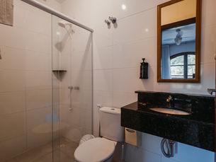 Suíte com varanda e 20m². Conta com 1 cama casal de 1,6m x 2m ou 2 solteiros. Possui: ar condicionado quente ou frio, frigobar, Wi-Fi, Smart TV 43", banheiro, telefone, mesa trabalho e estacionamento.